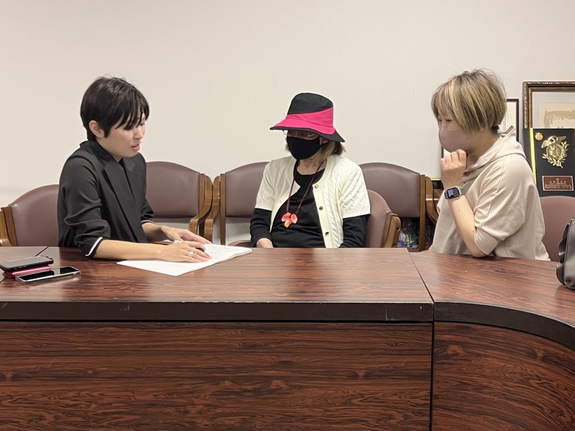 (山田満知子、本郷裕子、田中総司の3人が大会で着用するジャケットなどに協賛社のワッペンをつけます)