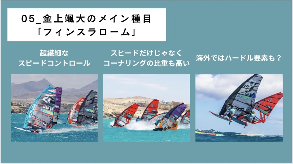 これまで3種目を掛け持ちしてプロツアーに出場していました。しかし、メイン種目のフィンスラロームの成績が振るわない時期が続いています。そのため、今季からフィンスラロームに照準を合わせ、プロツアーランキング1位を本気で狙いにいきます。