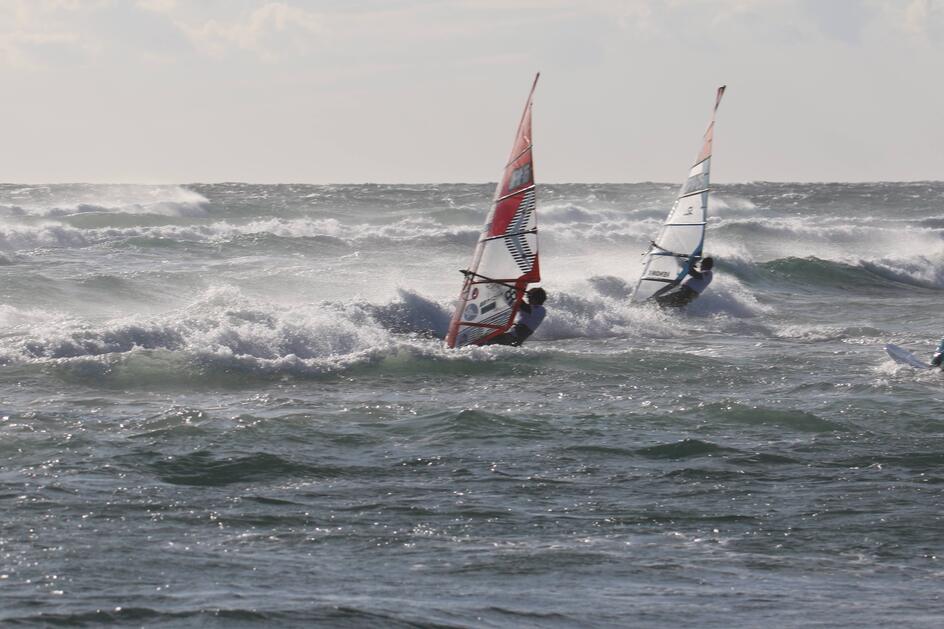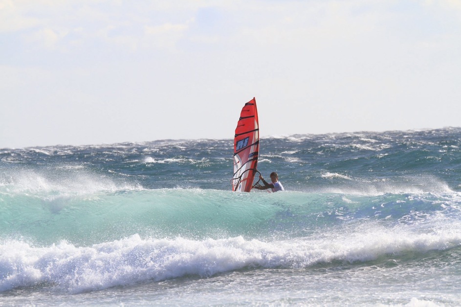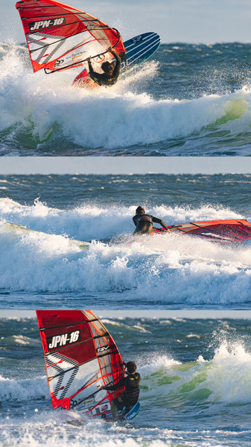 このような状況下ではスポット参戦しているウェーブの選手が非常に有利となります。理由はスラロームの選手は年間で使用できるセイルのサイズが5種類までという制限があり、今回のような爆風に特化したセイルを登録することが難しいからです。一方でウェーブの選手はこの大会だけに合わせた登録ができます。そのためスラロームの選手がのたうち回る中ウェーブの選手は快適にセーリングできるという状況になりました。